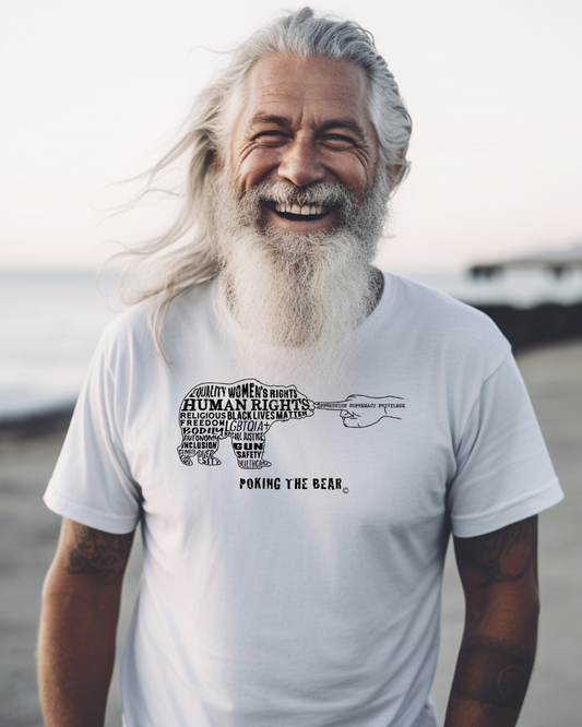 Our 'Poking the Bear' design showcases a bear adorned with words representing today's critical issues—human rights, diversity, unity, bodily autonomy, and more. The finger poking the bear’s nose symbolizes oppression, supremacy, and privilege. Our design highlights the necessity of coming together in light of our differences, emphasizing that we each hold the right to embrace our individuality and we are stronger when united. Wear it to stand against oppression and to champion collective strength in this crucial time in history.